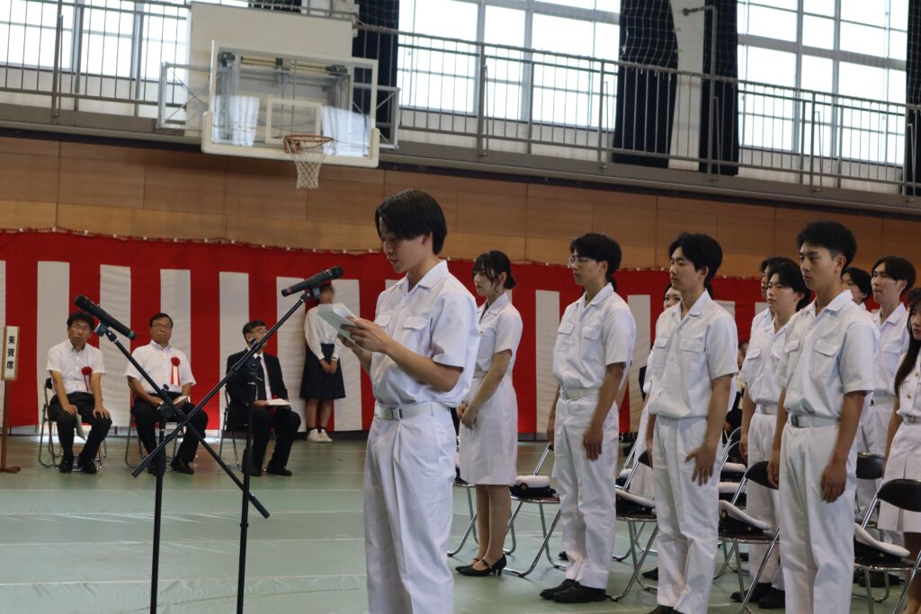 航海実習用の白い制服に身を包んだ商船学科卒業生40名へ卒業証書が、海事システム工学専攻修了生2名へ修了証書・学位記が手渡され、國枝校長から「戦争や災害など不確実性の増す世の中でも、AIには代替できない価値ある人間力と困難から立ち直るレジリエンスなどを大切にし、自信を持って新たな世界へ果敢に挑戦してください。」と告辞がありました。