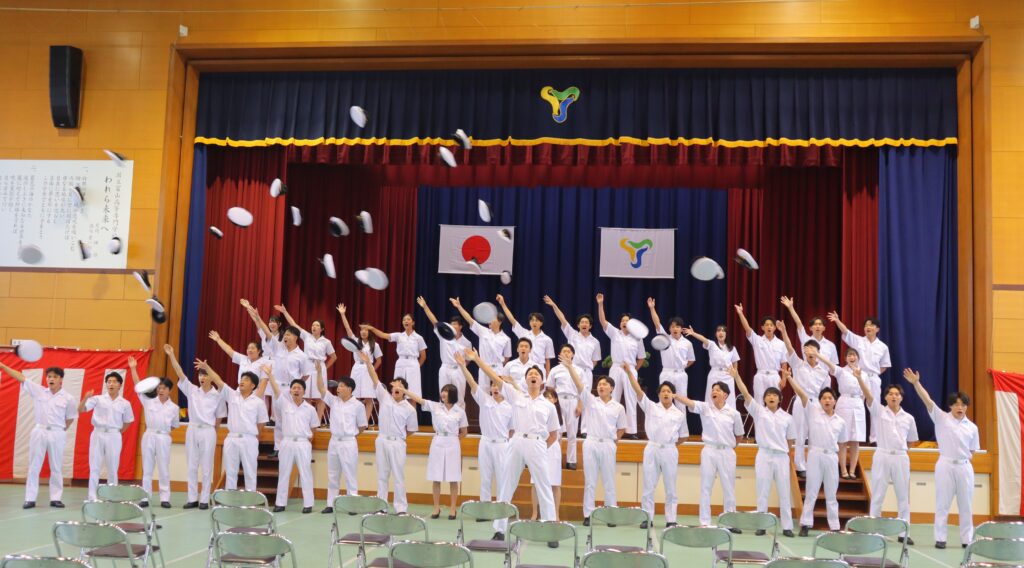 最後に卒業生たちは、帆船の出航時に行われる「登檣礼(とうしょうれい)」の儀式にならって「ごきげんよう」を三唱した後、制帽を高らかに投げ、新たな人生への船出を祝う大きな拍手に包まれながら、輝く未来へと旅立ちました。