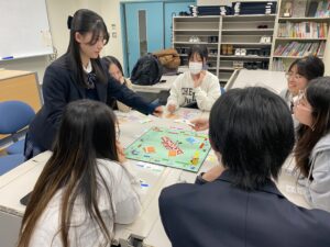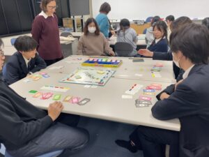令和7年12月22日に、射水キャンパスにて英語でのボードゲーム交流会を実施しました。この交流会には射水・本郷の各キャンパスの日本人学生に加え、留学生も参加しました。ボードゲームにモノポリーを用いたことで、参加したすべての学生が英語で交渉し、コミュニケーションをとりました。これまで各キャンパスで同様の交流会が行われてきましたが、今回初めて両キャンパスの学生・留学生を交えての交流会となりました。