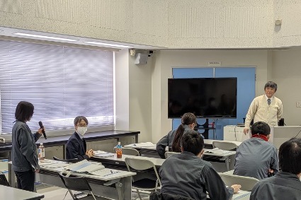 研修会では、射水市役所防災・資産管理課の方をお招きし「災害に備えて」と題した特別講演を開催し、災害から身を守るために必要な知識や対応、備え、ハザードマップの活用法、避難情報の受け取り方等について学びました。また、技術職員による職務に関連した発表が2件行われ、研修参加者は分野を問わず理解を深めることができ、今後の業務につながる研修会となりました。