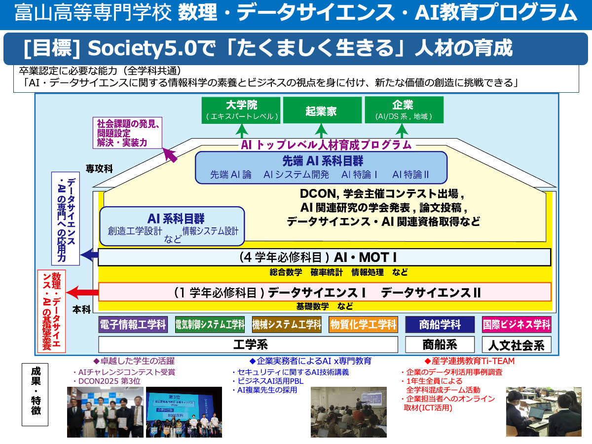 AI戦略2019に示された「数理・データサイエンス・AI」は、デジタルトランスフォーメーション(DX)社会の「読み・書き・そろばん」です。 「富山高等専門学校数理・データサイエンス・AI教育プログラム」では、平成29年度から低学年で「リテラシーレベル」としてAI・データサイエンスの基礎を、令和2年度から中高学年で「応用基礎レベル」に対応した科目にて各専門分野でのAI・データサイエンスの応用力を身につけます。 本教育プログラムについては毎年度自己点検し、教育プログラムの改善、進化に努めています。「リテラシーレベル」において各学科異なる複数科目で構成されていたプログラムを、令和3年度からの新カリキュラムでは1年生の全学必修科目「データサイエンスⅠ、Ⅱ」とし、教育プログラムの内容を改善するとともに受講生にとりわかりやすいものに変更しました。 |