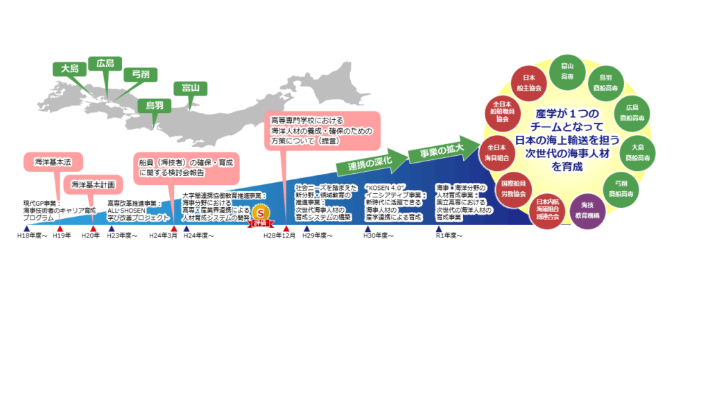 そして令和元年度から現在まで,文部科学省の「国立高専における次世代の海洋人材の育成」事業の一環として「海事・海洋分野の人材育成事業」を推進しております。このプロジェクトでは,これまでの事業において開発されてきた多くの先進的な共同教育プログラムを強化し実装し,グローバルな海洋人材の育成,技術革新に対応する高度な専門教育の実践,産学の強固な連携によるキャリア教育の展開などに取り組んでおります。