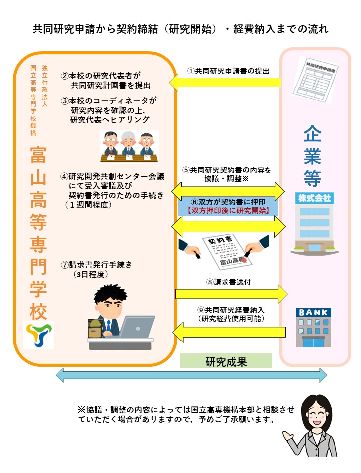 独立行政法人国立高等専門学校機構共同研究実施規則及び富山高等専門学校共同研究実施規則をご一読の上、本校との共同研究について、ご検討をお願いします。